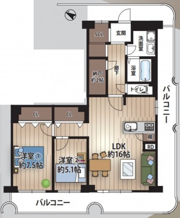 引廻しバルコニーで全てのお部屋に開口部がございますので、風通しよく快適にお過ごしいただけます。