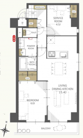 7階角部屋部分、1LDKタイプの間取にサービスルームがついたお部屋でございます。
