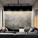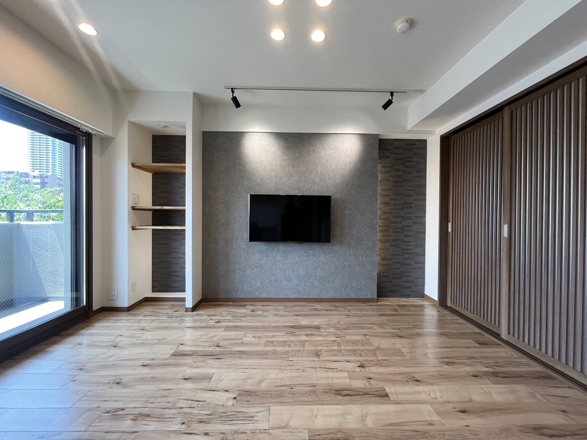 壁掛けTVの壁紙をダークグレーにすることで、アクセントとなり、