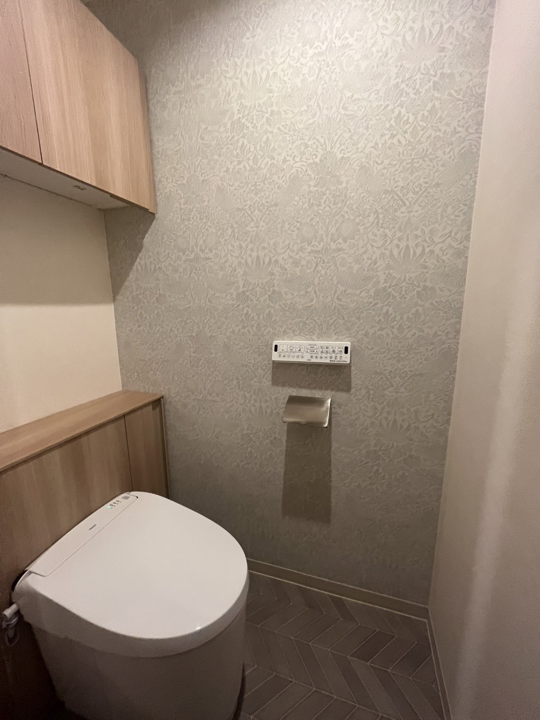 トイレは、デザイン性の高いタンクレストイレで、収納棚を造作しました。