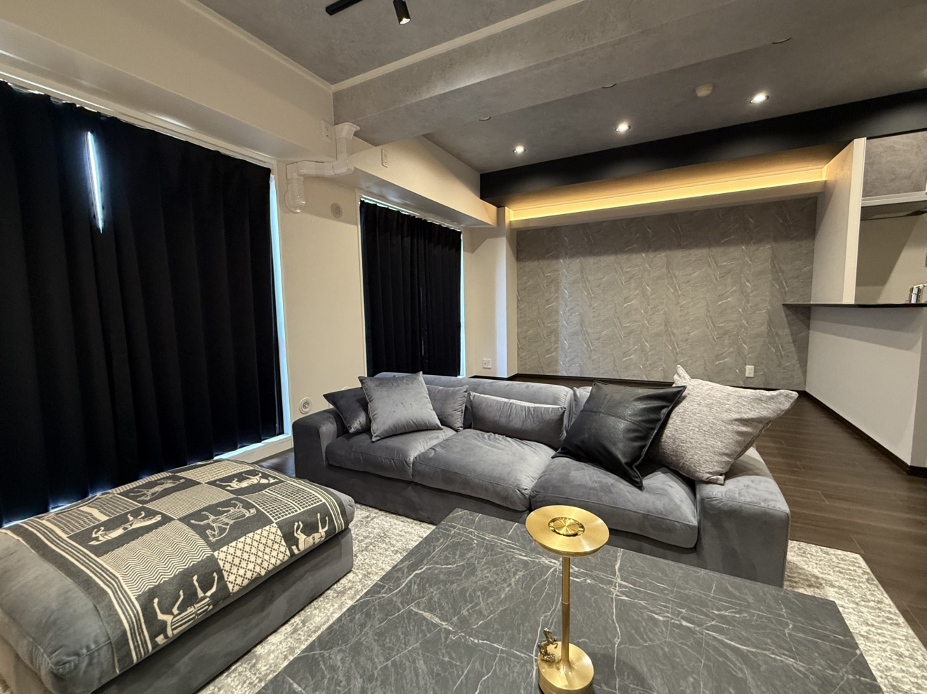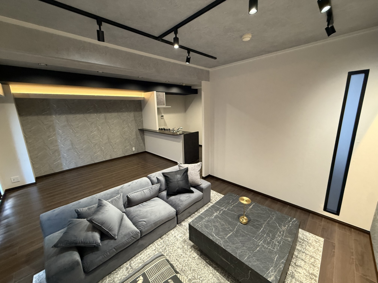 視線の先には大理石のローテーブルが佇み、その質感と重厚な存在感が空間全体に洗練された印象を添えます。